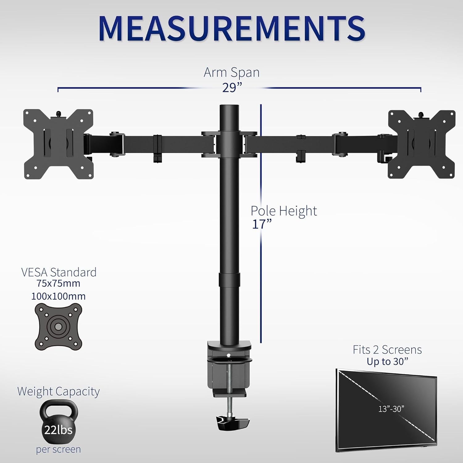 - Fits 13" to 30" Screens - Dual monitor mount fitting two screens 13” to 30” in size and up to 22 lbs in weight each with VESA 75x75mm or 100x100mm backside mounting holes. Cable management clips are provided along the arms and center pole.