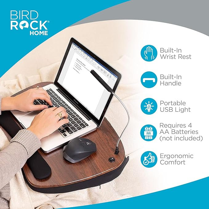 - INCLUDES USB LIGHT AND TABLET SLOT FOR ADDED CONVENIENCE: This versatile lap desk comes with a detachable USB light, perfect for reading or working in low-light conditions, and a dedicated tablet slot to keep your device secure. With dimensions of 22" x 14.5" x 2.55", the desk provides ample space for laptops, notebooks, and accessories. 4 AA are required for USB light (batteries not includes)