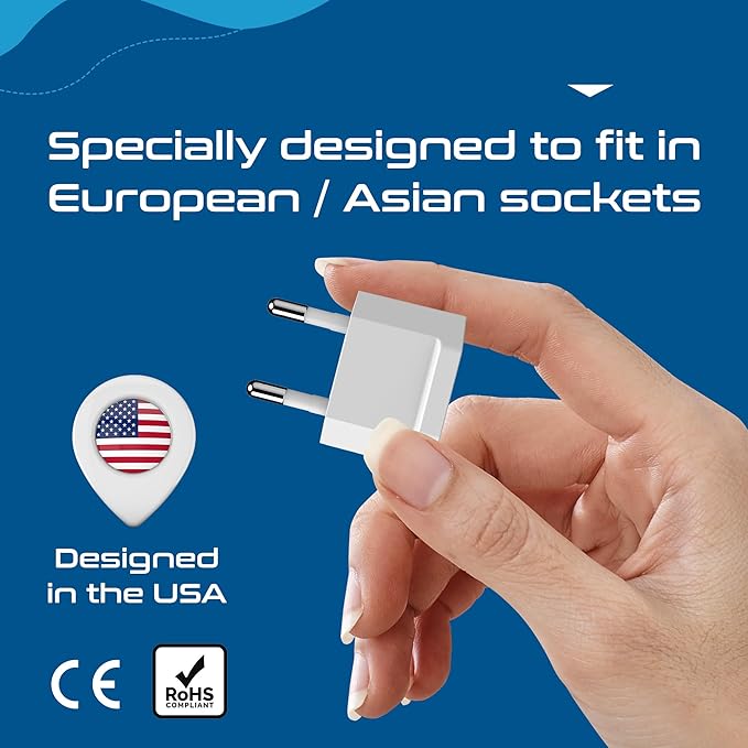 - MULTI-PURPOSE: The set includes 6 US to European Adapters, perfect for charging devices like Bluetooth speakers, headphones, shavers, laptops, and more. A must-have for your international travels.