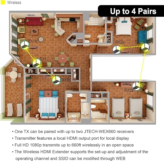 - 𝐂𝐎𝐍𝐍𝐄𝐂𝐓 𝐌𝐔𝐋𝐓𝐈𝐏𝐋𝐄 𝐏𝐀𝐈𝐑𝐒 𝐖𝐈𝐓𝐇 𝐍𝐎 𝐈𝐍𝐓𝐄𝐑𝐅𝐄𝐑𝐄𝐍𝐂𝐄 – Connect up to 4 wireless HDMI extender transmitter & receiver set pairs. No line of sight placement required. No difficulties sending or receiving signals through walls, ceilings, and floors