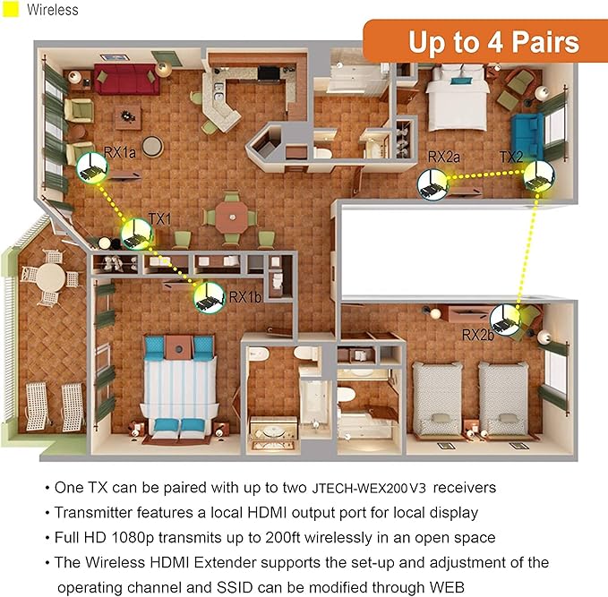 - √ 𝐔𝐩 𝐓𝐨 𝟒 𝐒𝐞𝐭𝐬 𝐈𝐧 𝐓𝐡𝐞 𝐒𝐚𝐦𝐞 𝐄𝐧𝐯𝐢𝐫𝐨𝐧𝐦𝐞𝐧𝐭: Connect up to 4 independent pairs of JTECH-WEX200V3 in the same environment without interference. Users can customize both the SSID and 5GHz operating frequency of each WEX200V3 set to allow for multiple extender sets in the same environment.