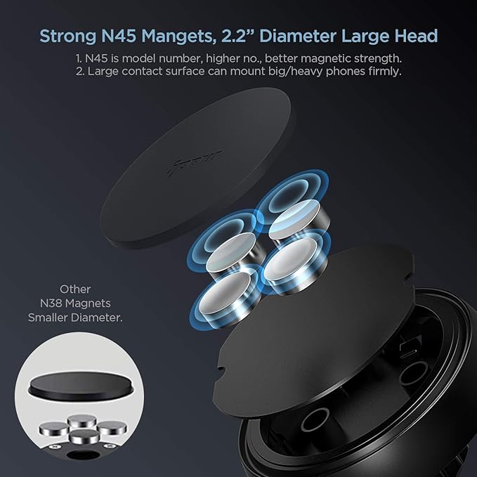 - 【Powerful N45 Magnets, Secure Hold for Heavy Phones】 Equipped with 4 premium N45 neodymium magnets and a 2.2" large magnetic surface, this magnetic phone mount for car ensures a rock-solid grip on your smartphone—even during bumpy roads, sharp turns, or sudden stops. It securely holds larger and heavier phones, even those with thick protective cases, without slipping or vibration. Simply slap your phone on and go—no more struggling with clamps or brackets!