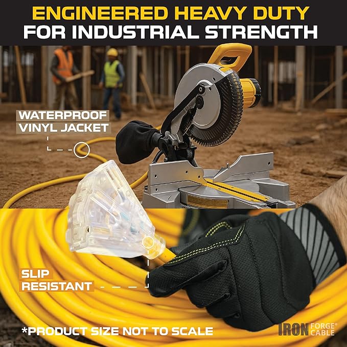 IRON FORGE CABLE 15 Foot Lighted Outdoor Extension Cord with 3 Electrical Power Outlets - 12/3 SJTW Heavy Duty Yellow Extension Cable with 3 Prong Grounded Plug for Safety