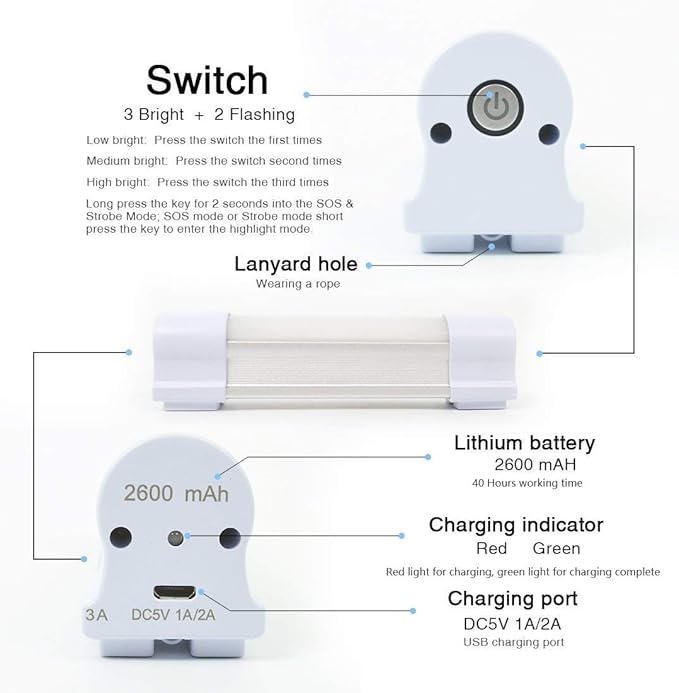 - 5 LIGHTING WORK: 100% brightness, 50% brightness, 10% brightness, strobe mode and SOS mode, multi-function wireless LED fluorescent meet your different need. Premium LED tube light with 2600 mAh capacity battery, support for 40H working time