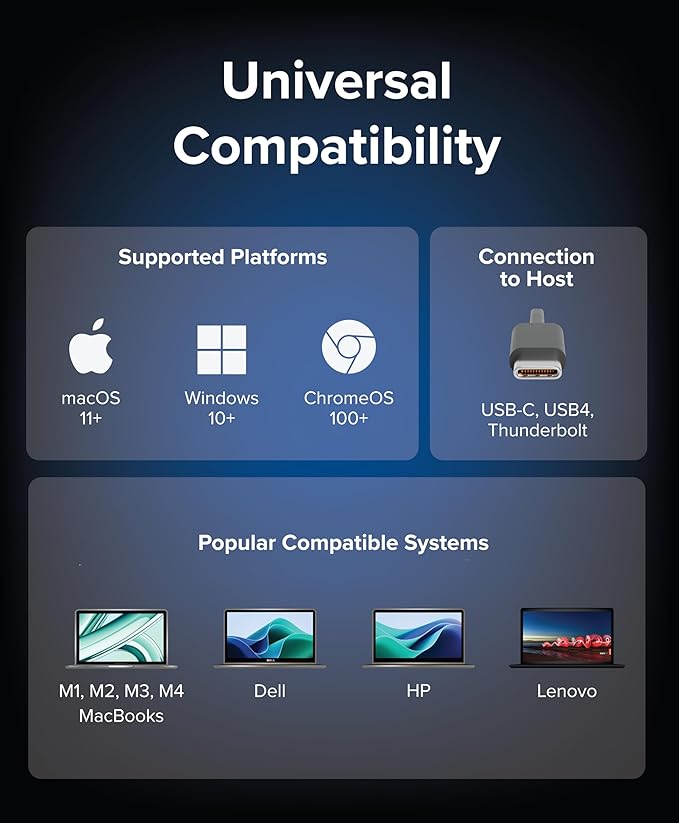 - Compatible Devices : Supports full-featured USB-C, USB4, and Thunderbolt systems running Windows 10 / 11 & ChromeOS 100 or newer & macOS 11 and later including, M1/M2/M3/M4-based MacBooks (Base models and Pro / Max models), Intel-based Thunderbolt 3 MacBooks (late 2016+), HP ProBook / EliteBook / Spectre x360 series, Dell XPS / Latitude / Inspiron series, Lenovo ThinkPad / IdeaPad / Yoga, Microsoft Surface Pro / Go / Book / Laptop models, LG Gram, Thousands of other laptops which are compliant with full-featured, standards-compliant USB-C ports Supports full-featured USB-C, USB4, and Thunderbolt systems running Windows 10 / 11 & ChromeOS 100 or newer & macOS 11 and later including, M1/M2/M3/M4-based MacBooks (Base models and Pro / Max models), Intel-… See more