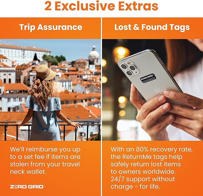 - UNRIVALED VALUE INCLUDED **BONUS #1** - EXCLUSIVE $300 TRIP ASSURANCE: In the event items are stolen from this passport holder, we will reimburse you up to $300. Complete Peace of Mind for your upcoming Trip! **BONUS #2 ** GLOBAL LOST & FOUND TAGS - Each Zero Grid Travel Wallet includes 2 Recovery Tags from ReturnMe, the worldβs largest lost & found company. By purchasing this pickpocket proof wallet from Zero Grid, this service is FREE for life.