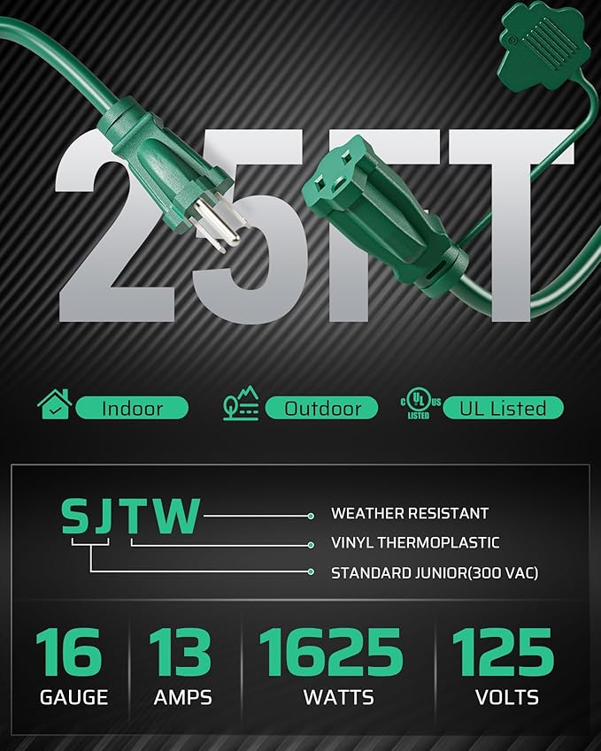 - 【 Evenly Spaced 3 Outlets 】 25 feet total length; evenly-spaced 8 feet apart from each plug; green extension cord with 3 spaced outlets helps use less cords to set up landscape lighting and Christmas decoration easily