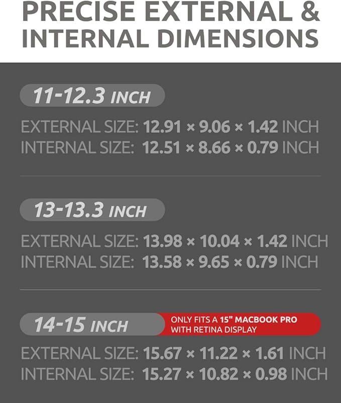 - Warranty & Compatibility: You can get a 12-month worry-free warranty, friendly and timely customer support, and a laptop sleeve that perfectly fits: 14-inch New MacBook Pro M3/M2/M1 Chips Pro/Max A2992 A2918 A2779 A2442 2023-2021, 13-inch MacBook Air M2/A2681 with a Hard Shell Case on it, 12.9-inch iPad Pro 3rd-6th Gen with Magic Keyboard Folio / 15 inch New MacBook Air M2 A2941 2023, 15 inch New Microsoft Surface Laptop 5/4/3, Dell XPS 15 Plus 2023-2020, 15-inch MacBook Pro (A1990 A1707), etc. External Size: 15.67 × 11.22 × 1.61 inches;Internal Size: 15.27 × 10.82 × 0.98 inches