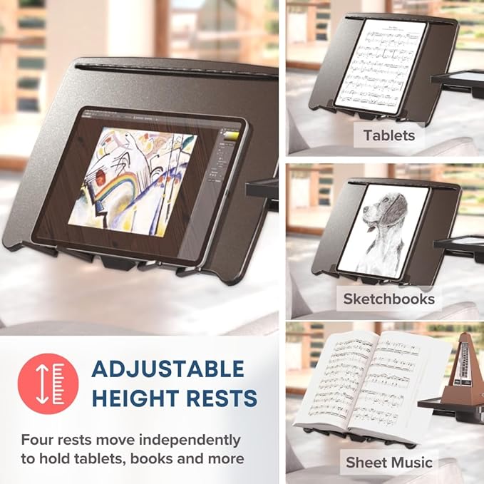 - FITS MOST DEVICES & TILTS 0°–70° FOR ERGONOMIC VIEWING – Holds notebooks up to 16″ wide (5 lb max), plus tablets, sketchpads, books, or documents. Tilts from flat to 70 degrees for ideal posture whether sitting, reclining, or lying down. Includes safety bungee to secure your device at any angle. Adjusts quickly between seated and standing positions, making it a versatile mobile workstation for home or office.