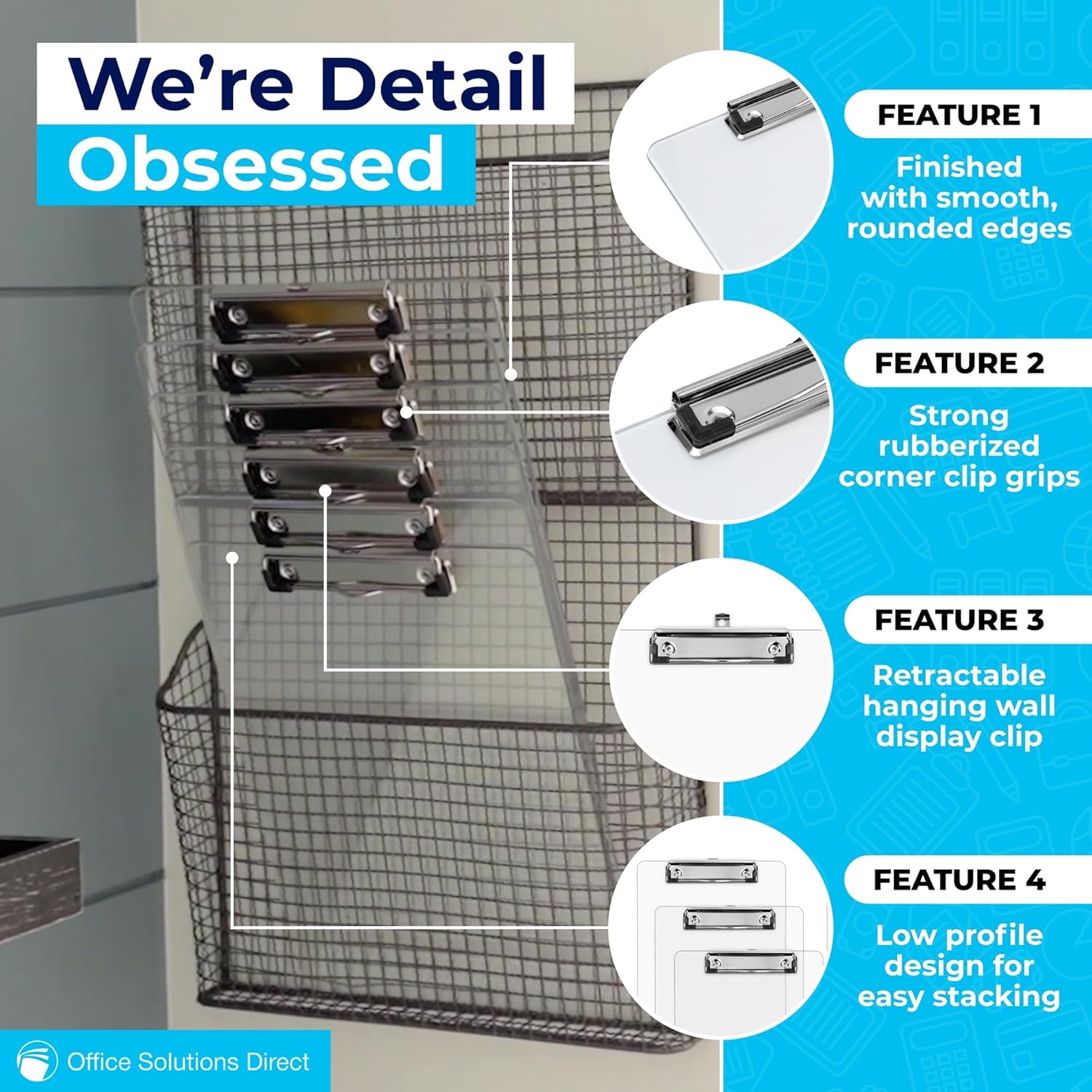 Plastic Clipboards (Set of 6) Transparent Clipboard (Clear) Strong 12.5 x 9 Inch | Holds 100 Sheets! Acrylic Clipboards with Low Profile Clip | Bulk Back to School Supplies for Teachers