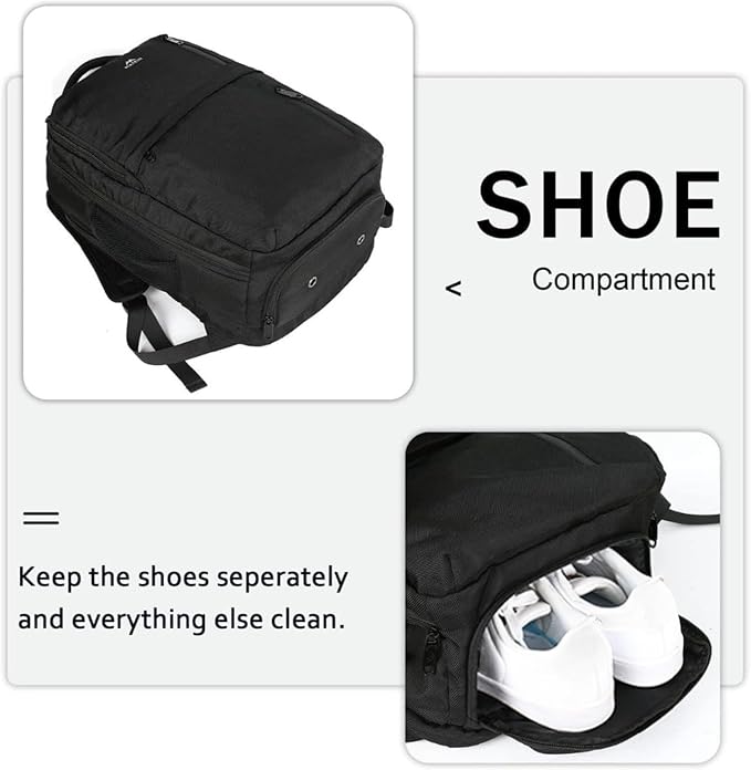 - Versatile & Convenient: External USB port with built-in charging cable conveniently charges your phone and other electronic devices (pls provide your own portable charger). The bottom shoe compartment fits sizes 10–12 and includes venting holes to help reduce odors. As it’s built into the main section, it may use some space, but also works great for holding toiletries or accessories. This backpack with shoe compartment keeps essentials neat, accessible, and ready for business trip or adventures