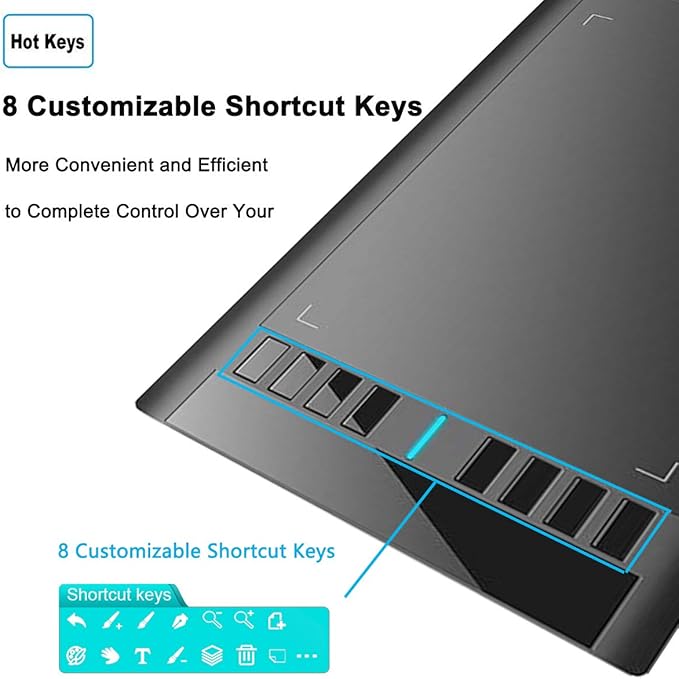- 【Ergonomically Designed Shortcuts】: 8 customizable express keys on the side for short cuts like eraser, zoom in and out, scrolling and undo, provide a lot more for convenience and helps to improve the productivity and efficiency when creating with the drawing tablet;