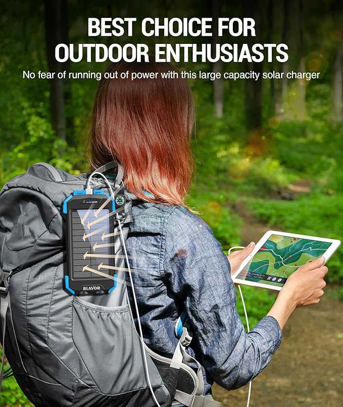 - Multi-Purpose Outdoor Power Bank: BLAVOR portable solar charger is made to be IPX5 waterproof, dustproof and shockproof. The built-in dual super bright flashlights and the included compass carabiner can further ensure your safety when traveling outdoors, making it an ideal companion for outdoor enthusiasts.