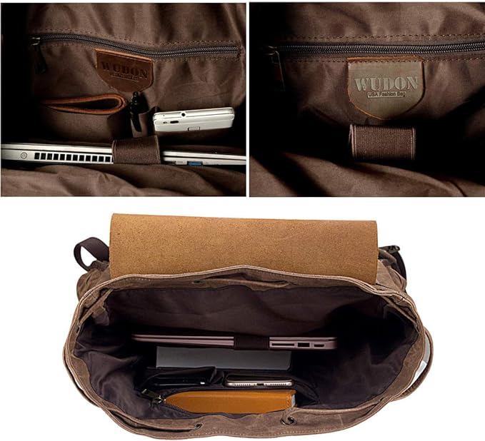 WUDON Leather Backpack for Men, Waxed Canvas Shoulder Rucksack Carry-On Travel Backpack