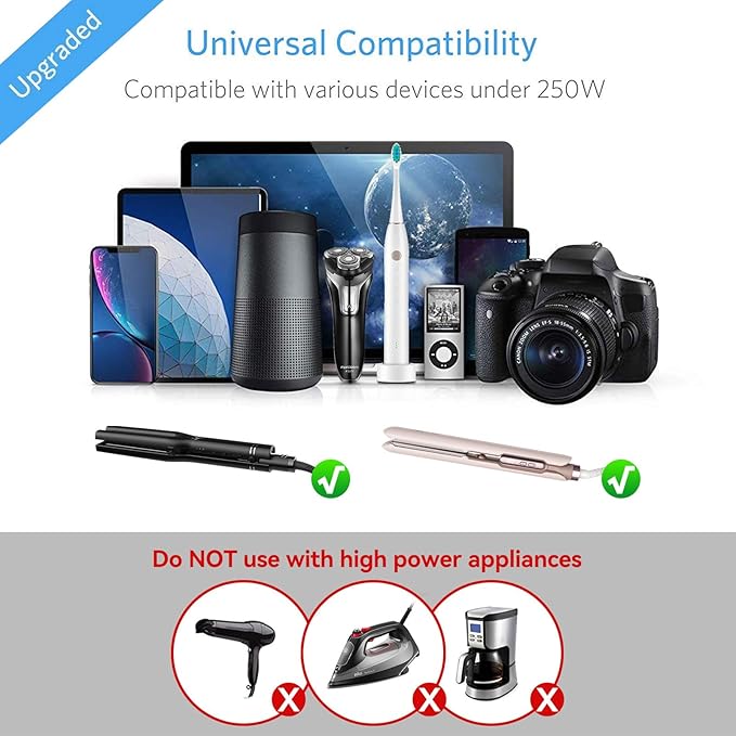 - NOTICE: Not compatible- hair dryer, iron machine, coffee machine, etc. (Regardless of their wattage)