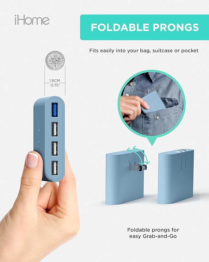 - FOLDABLE PRONGS: You won't find another iPhone block wall charger that fits as easily into your bag or suitcase as the iHome AC Pro 4 USB wall charger.