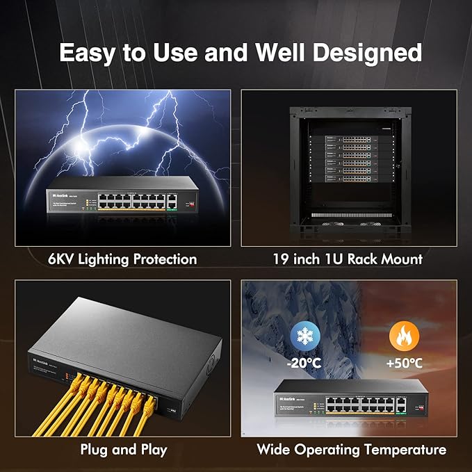 - 18 Ports: Includes 16 POE ports(10/100Mbps) and 2 Gigabit UpLink ports(10/100/1000Mbps). The 2 gigabit uplink ports can provide more bandwidth and connect to different devices, such as routers, NVRs, etc.