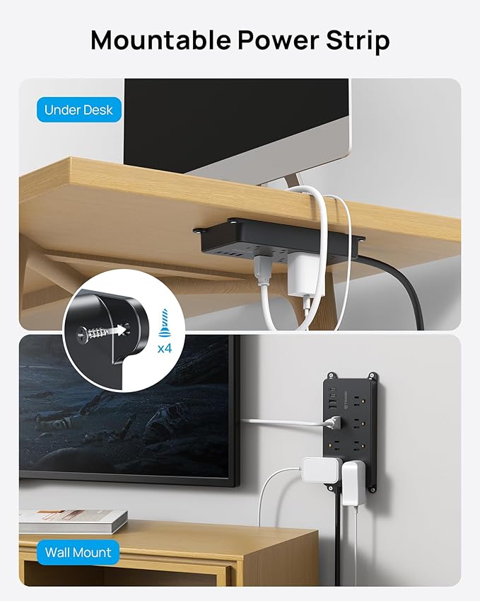 - Power Strip Mountable: This wall mount power strip is a screw mountable design. Four screw-mounting tabs allow you to install this mountable power strip securely. The wall-mounted design saves space on your desk. This power strip is ideal for your use in various applications, including the entertainment center, dorm room, guest room, garage, desktop, under counters, workbenches, wall mounts, floor mounts, etc