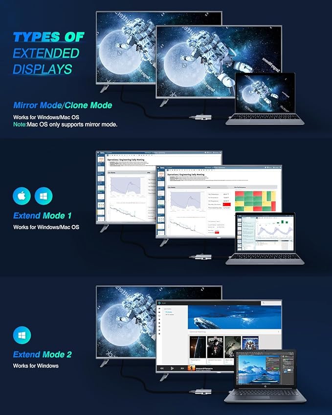 - * * * *MacOS System ONLY supports MIRROR MODE due to the limitations of Mac itself.* * * 【Dual HDMI Adapter for Multi-Screen Setup】USB C hub multiport adapter comes with a dual monitor setup which maximum single outputs up to 3840*2160@30hz resolution. For Windows systems, it supports dual HDMI display up to 1920*1080/60Hz. The final resolution of HDMI output depends on your host devices. USB C to HDMI adapter using different applications on each screen enhances multitasking and productivity