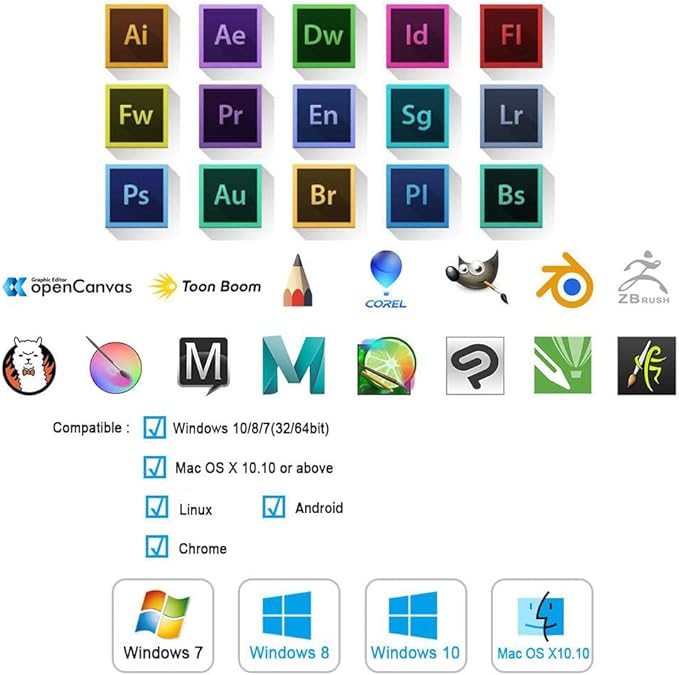 - 【Digital drawing tablet,Compatible with PC Multiple Systems】 This graphics tablet is compatible with Windows 7/8/10/11or later, Chrome OS 88 or later and Linux, Mac OS 10.12 or above after download latest driver from UGEE official website, Creative software and Driver Program works: for example: Adobe Photoshop/Photoshop CC/Illustrator/LightRoom/Corel Painter/Autodesk MAYA/Pixologic ZBrush/ Macromedia Flash/Comic Studio/SAI and etc.drawing software. [Note: NOT SUPPORT iPhone]