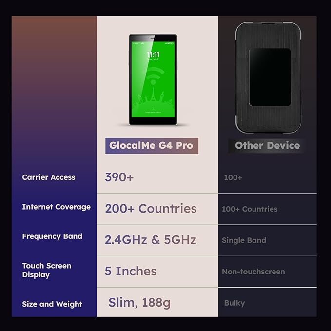 - 【Portable WiFi for Global Travel】Keep seamless connectivity with GlocalMe, your pocket-friendly companion that offers secure and reliable mobile WiFi hotspot coverage in over 200 countries. Our patented CloudSIM technology porvides smart local network auto-selection for optimal internet signal, which makes it ideal as a hotspot device for your global travels or business trips. For example, there are AT&T, T-Mobile and Verizon coverage at the same area, AT&T has poor network condition while Verizon has the best, G4 Pro will select Verizon for you to use. Say goodbye to interruptions and lags so your life stays seamlessly integrated whether online or off.