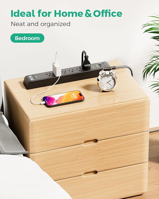 - 【Electric Strip with Overload Protection】 - Slim, sleek and compact design reduces office clutter; Lighted power switch with an 15-Amp circuit breaker to signify your devices are protected from power surge, over-heated, overload, over-charging,Fire-prevention ( 1382℉. )