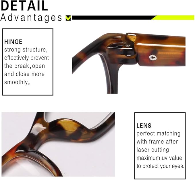 - HIGH-QUALITY MATERIALS โ PC lens, strong impact will not be damaged,Anti scratch and explosion-proof,frame,Extremely durable and lightweight,metal hinges to ensure durability ,The arbitrarily swingable spring leg design also reduces the squeezing of the glasses to the head.