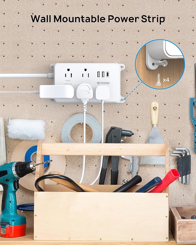 - Power Strip Wall Mountable: This wall mount power strip is a screw mountable design. Four screw-mounting tabs allow you to securely install this power strip and easily be reached, including behind the TV, workbench, garage, bedside, bathroom, laundry room, or under desk or cabinet, which is very low-profile and saves desktop space for you