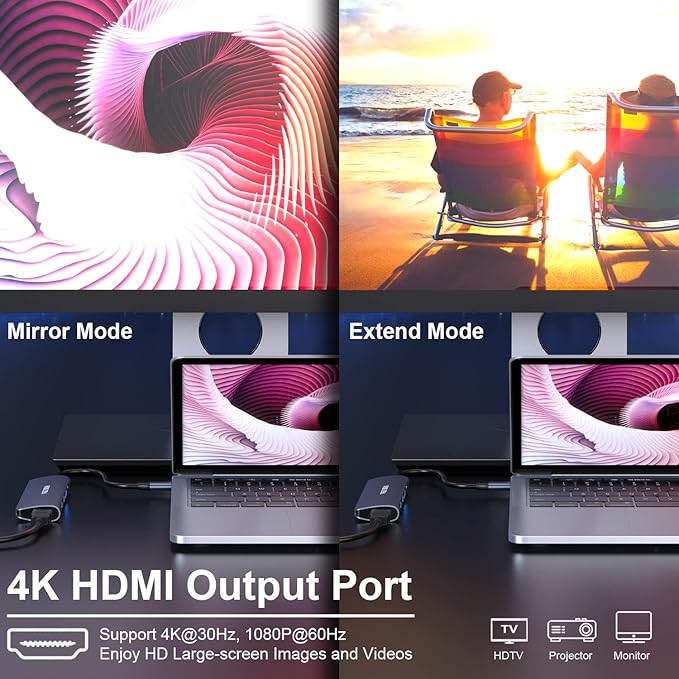 - HDMI 4K Visual Feast: The HDMI of this USB C Hub supports media display at resolutions to 4K 30Hz or 2K 60HZ. Suitable for connection to monitors and projectors for home entertainment, office meetings, large screen viewing, etc.. Bringing you an immersive 3D resolution experience!