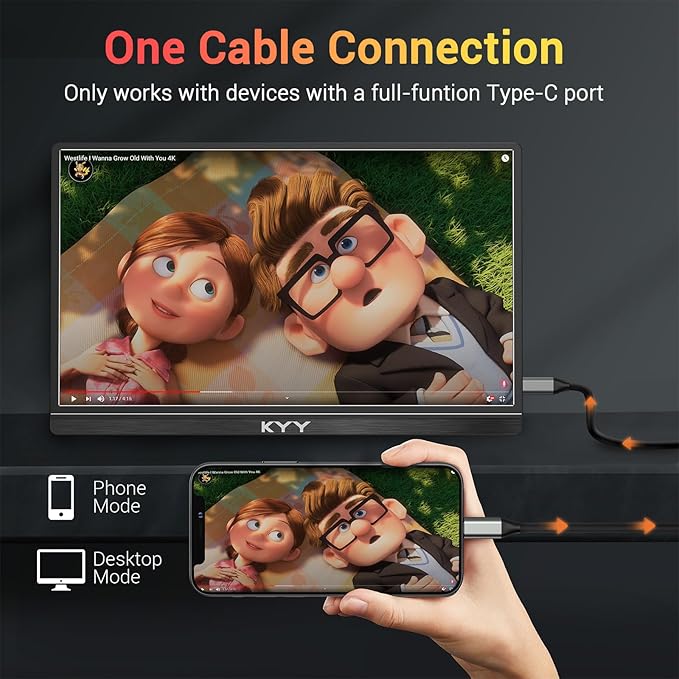 - [ Provide Everything You Need ]: KYY provides you an ultra-slim high-quality portable external monitor that can work in both landscape and portrait mode, a stable foldable smart cover, a screen protector film, 2 usb-c cable, mini-hdmi to hdmi cable. It has a unique designed premium black metal appearance, a friendly menu control wheel for setting, 2 built-in stereo speakers, and equipped with 3.5mm audio inputs to offer an enhanced entertainment experience when viewing videos and playing games