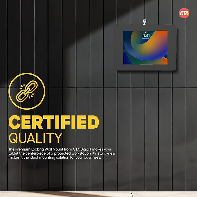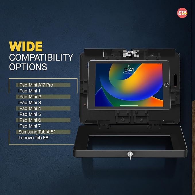 Locking iPad Wall Mount - CTA Anti-Theft Small Locking Tablet Enclosure w/ Key Lock & Interior Cable Routing for iPad Mini 1, 2, 3, 4, 5, 6, Samsung Tab A 8″, Lenovo Tab E8 - Black - (PAD-PSWB)