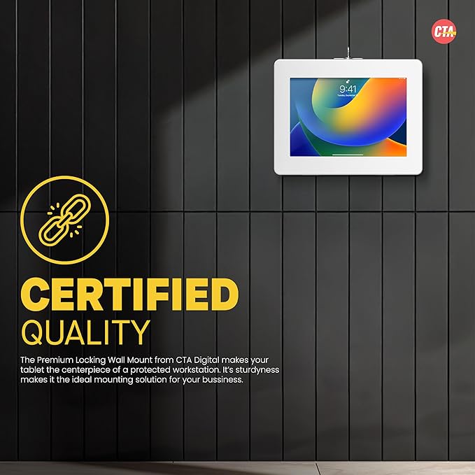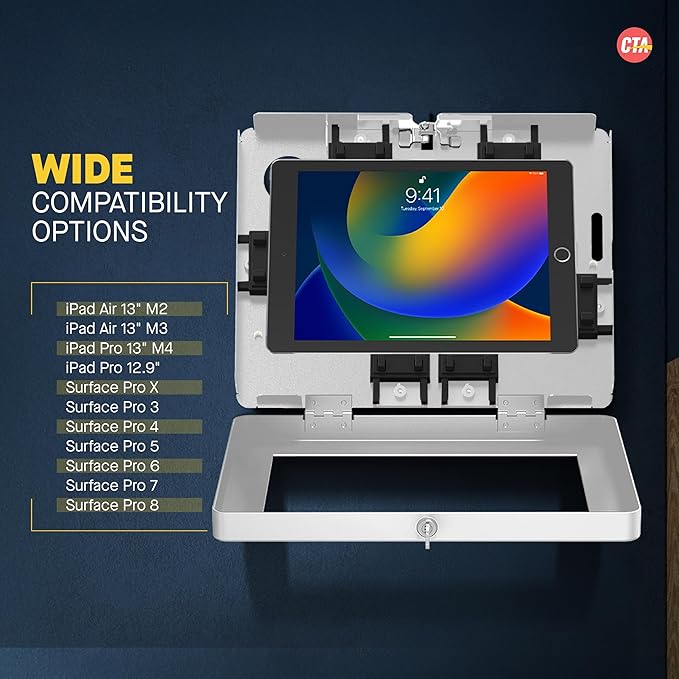 Locking iPad Wall Mount - CTA Anti-Theft Large Locking Tablet Enclosure w/ Key Lock and Interior Cable Routing for iPad Pro 12.9", Surface Pro 3, 4, 5, 6, 7, 8, X - White - (PAD-PLWW)