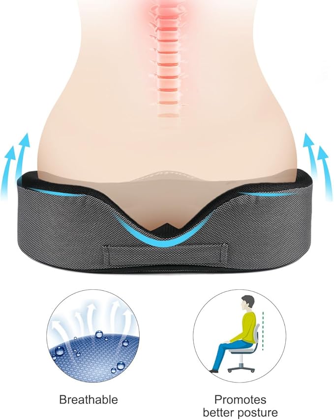 - Ergonomical Design: The tailbone cut-out with 2 hollow holes(4.3*3.1 inches) and ergonomic contours, helps you maintain better posture to relief lower back pain, neck pain, tailbone ((WARNING: this item can only relief pain, cannot replace medical instrument)