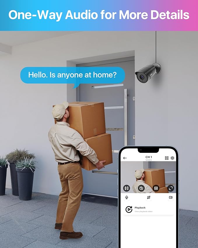 - 【1080P HD Bullet Camera with Microphone】With built-in microphone in the camera, so it can support a one-way audio, you can hear the other party talking, but not the conversation. 1080P high resolution provides clear images day and night.