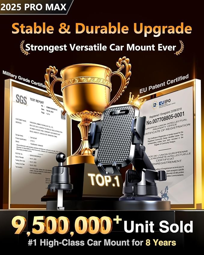 - 【True Military-Grade Certified, 2025 BEST Ultimate Model】VANMASS, the leader in high-end car phone holder. Over the past 8 years, We have listened to the voices of millions of users, rigorously tested to MILITARY GRADE standards (stability, compatibility, flexibility, security, durability). Finally, we overcome all weaknesses to design the Ultimate Model that we are most satisfied with. This item obtained international military-grade shockproof certification No. GZMR220601855501