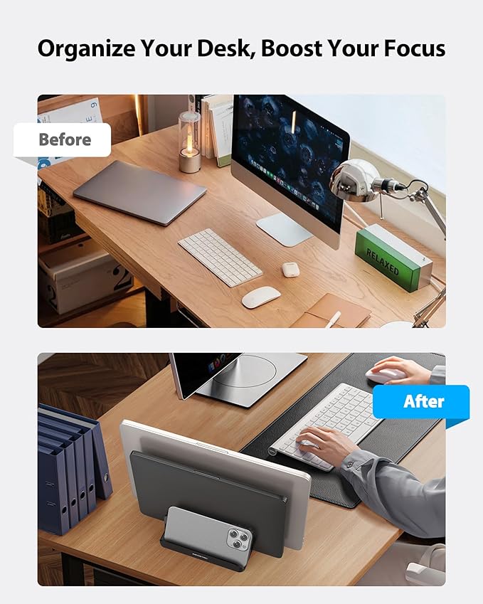 - Space Saving: Free up valuable desk space by storing your devices vertically. Our stand is the perfect way to create a clutter-free workspace and boost productivity.
