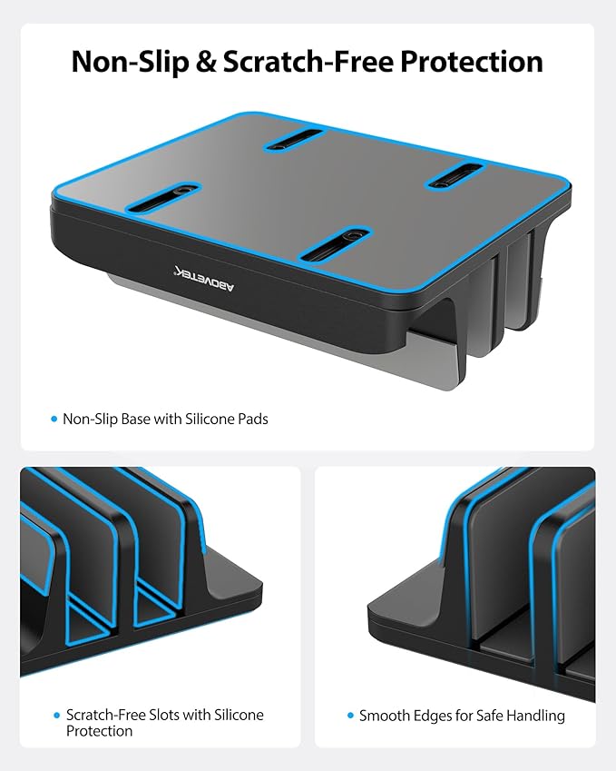 - Unmatched Stability: With a heavy-duty base and ultra-grip silicone mats, our vertical laptop stand keeps your devices upright and secure. Say goodbye to tipping, toppling, and dropping.