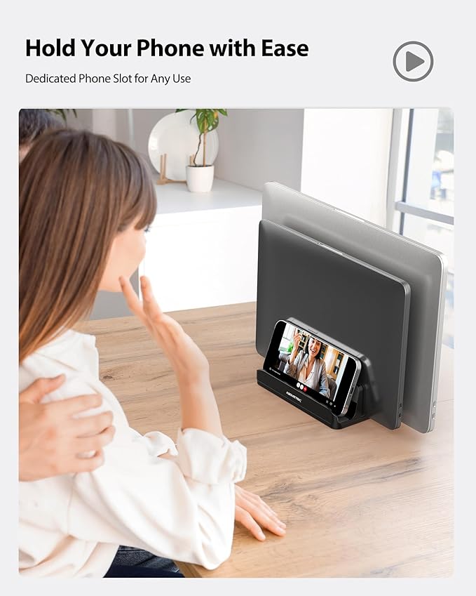 - 3-Slot Versatility: Accommodates two laptops (up to 17.3") such as MacBook, Surface, gaming laptops, and notebooks, plus one dock for phones like iPhone or Samsung. Suitable for a wide range of devices.