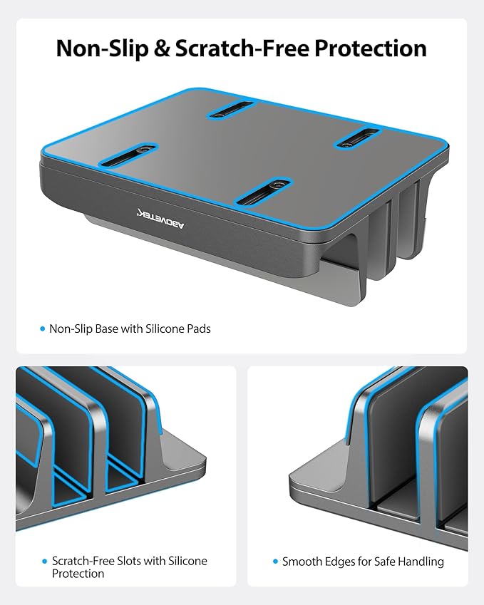 - 3-Slot Versatility: AboveTEK Vertical laptop stand 3 slot design accommodates two laptops (up to 17.3") such as MacBook, laptops, and notebooks, along with a dock for phones. This heavy duty laptop holder is suitable for a wide range of devices.