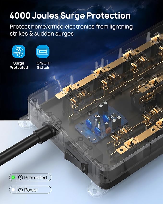 - 【Safety Certified】This power strip with usb ports is ETL certified and combines 4000J surge protection, overload protection, overcurrent protection, short circuit protection, and a 1382℉ fireproof shell to provide comprehensive safety protection for your tablet, TV, mobile phone, and other electronic devices against potentially damaging power disturbances.