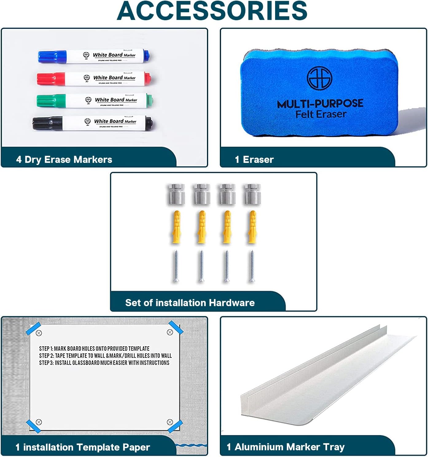 - 【Accessories included】: 4 dry earse markers, 1 glass whiteboard eraser, 1 removable aluminium marker tray, 1 template paper for mounting and 1 set of installation hardware. One stop shopping.