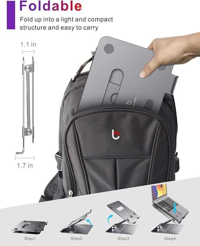 - 【Ventilated Cooling & Foldable】Laptop stand with aluminum alloy material on top can absorb and discharge heat at ease. What's more laptop riser has heat vent design increase natural airflow help you laptop cooldown, hence running at optimal performance longer, and even prolonging the life of your laptop. This computer stand can easily fold and fit into your bag and laptop case.