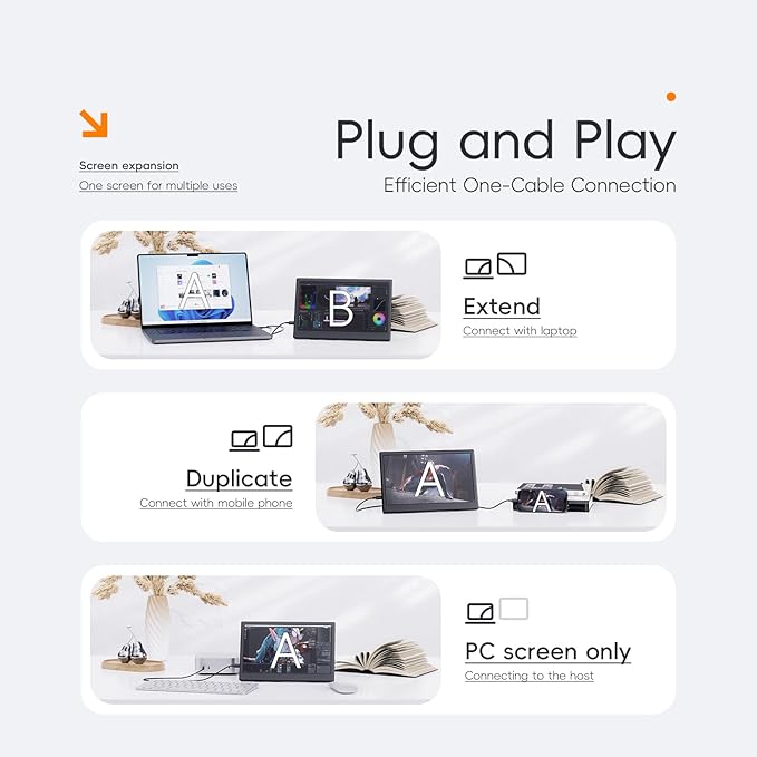 - 【Plug & Play Compatibility for All Devices】 This portable monitor liminates the hassle of drivers—simply connect via HDMI or USB-C to your Steam Deck,Switch,Xbox,PS5,laptop or PC and start using it instantly. Perfect for gamers who want to extend their console screen on the go,remote workers needing a dual display,or students multitasking.With 1366x768 resolution and 60Hz refresh rate, it delivers clear visuals for work,study,or gaming.