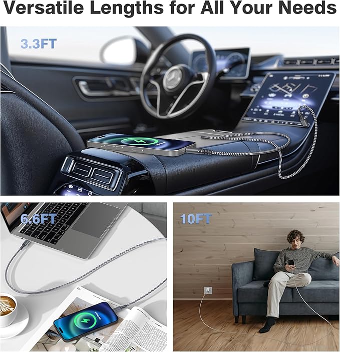 - (Three Lengths to Suit Your Needs) We believe in giving you choices, which is why our USB-C charging cable comes in three versatile lengths: short, medium, and long. Whether you need a compact cable for on-the-go charging, a medium-length option for everyday use, or a long and adaptable cord for reaching those inconveniently placed outlets, we've got you covered. Enjoy the freedom and flexibility to charge effortlessly, regardless of your environment.