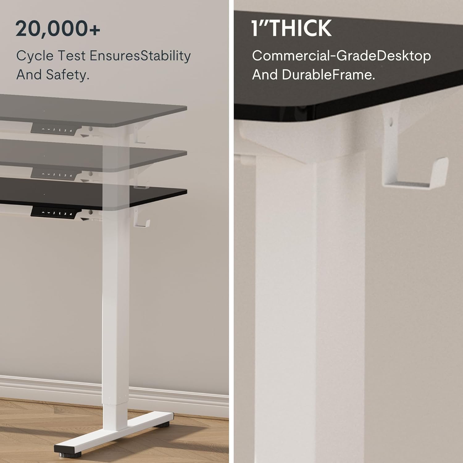 - 1" THICK ONE-PIECE DESKTOP:Experience the elegance of a completely smooth, seamless desktop surface. This design not only enhances the aesthetic but also ensures a sturdier and more stable structure compared to spliced tabletops.