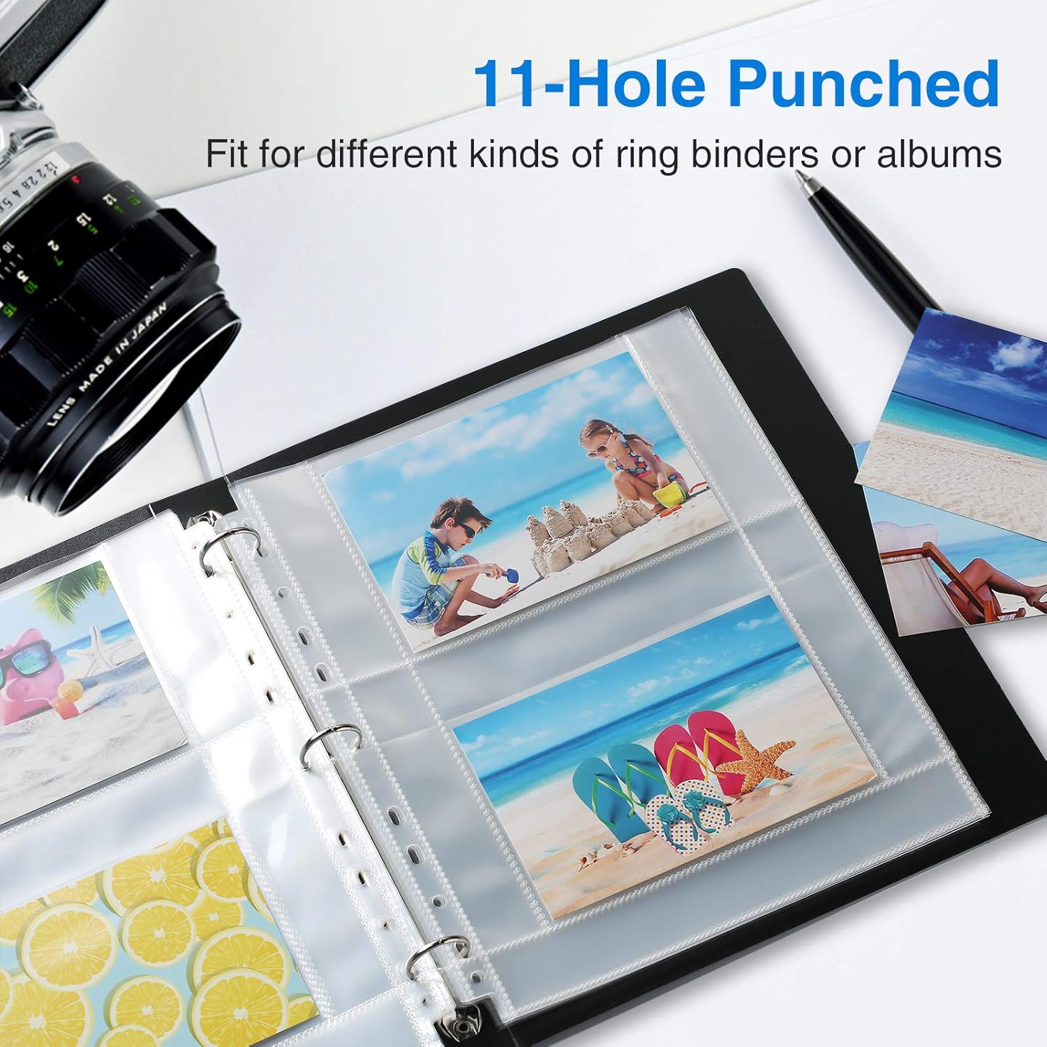 - 30 Pack Photo Sleeves: 11.2 x 9.25" photo album pages with 11-hole punched fit for 3 ring binder and other different kinds of ring binders or albums. The 4.25''x 6.1'' Pockets Perfect for 4''x 6'' or smaller photos or cards, 2 pockets per page, up to 4 photos with 2 inserted back-to-back, totally can hold up to 120 photos or cards.