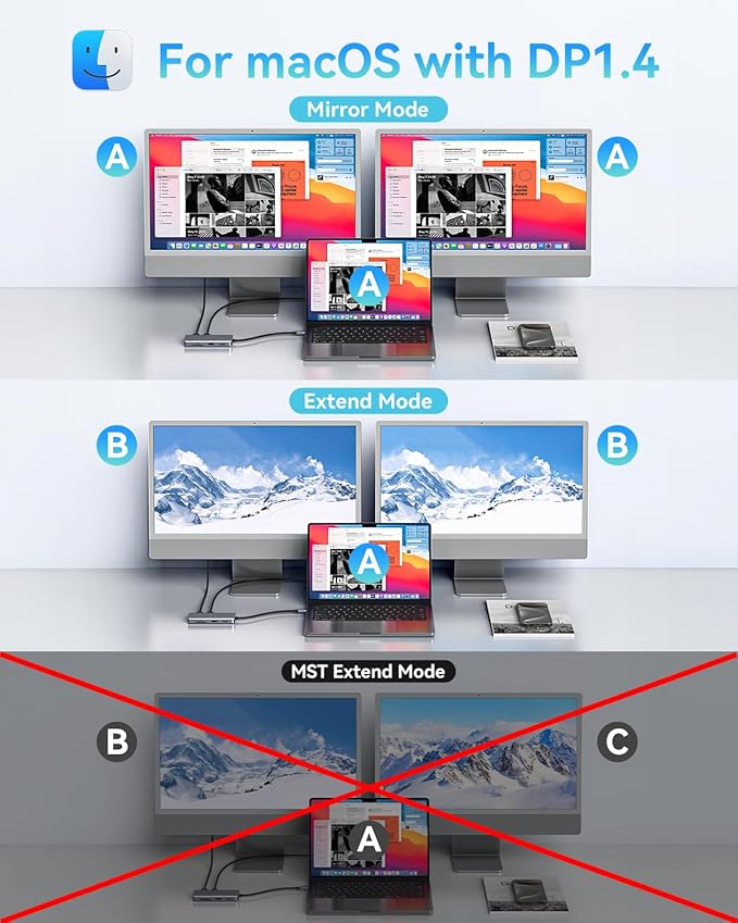 - 【Ultra 4K HDMI】 Outputting in 4K video quality, this usb c to dual hdmi hub maximizes the working efficiency for all visual creators. This usb c hub dual HDMI presents an Ultra-High-Definition video through 1HDMI for 4K 3840*2160@60Hz, 2HDMI for 4K 3840*2160@30Hz. Note: Limited by Apple Mac OS system itself, Mac OS system can only support SST mode, the display of 3 screens will be Laptop(A)+Monitor1(B)+Monitor2(B)