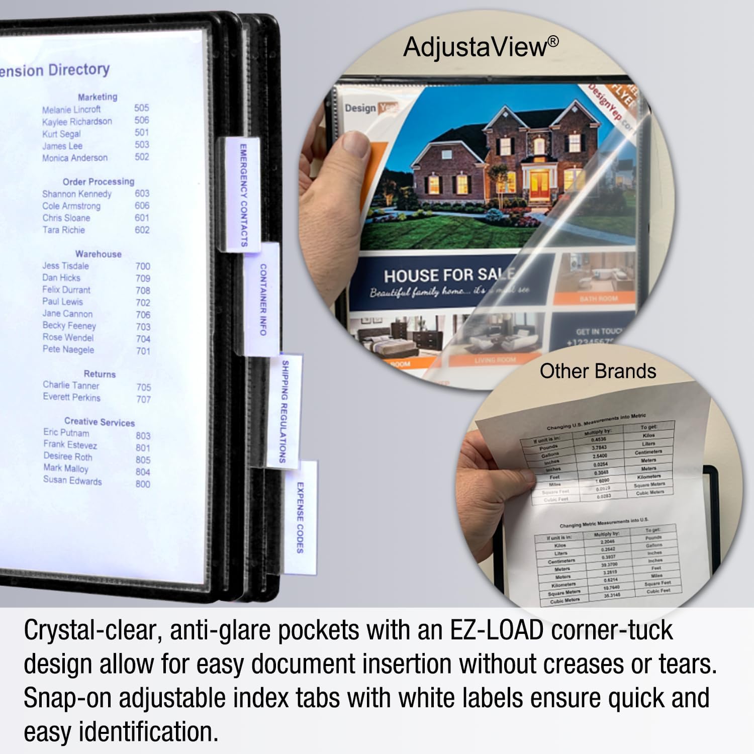 - EASY LOAD POCKETS & TABS - Crystal-clear protective, easy-load, corner-tuck pockets make inserting documents easy and free of creasing or tearing. Each pocket displays two single-sided sheets of 8 1/2" x 11" letter sized paper or one double-sided document. Adjustable index tabs and labels quickly direct you to the appropriate page.