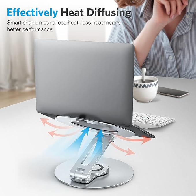 - ROTATABLE & ERGONOMIC: Featuring a 360° rotatable axis connecting with the base, this laptop stand allows you to swivel your laptop to any angle. It elevates your laptop to your eye level to fix your posture and reduce your neck and back stiffness.