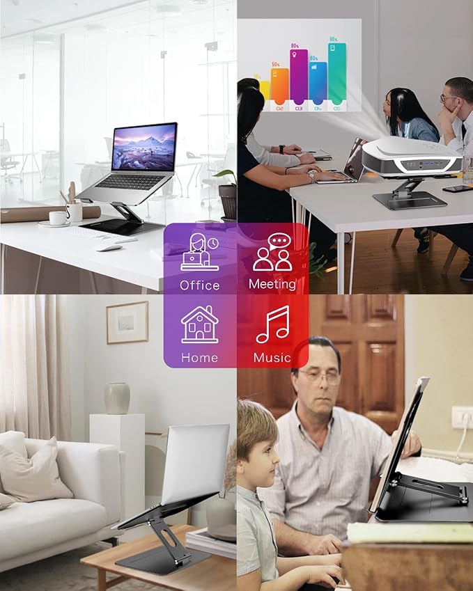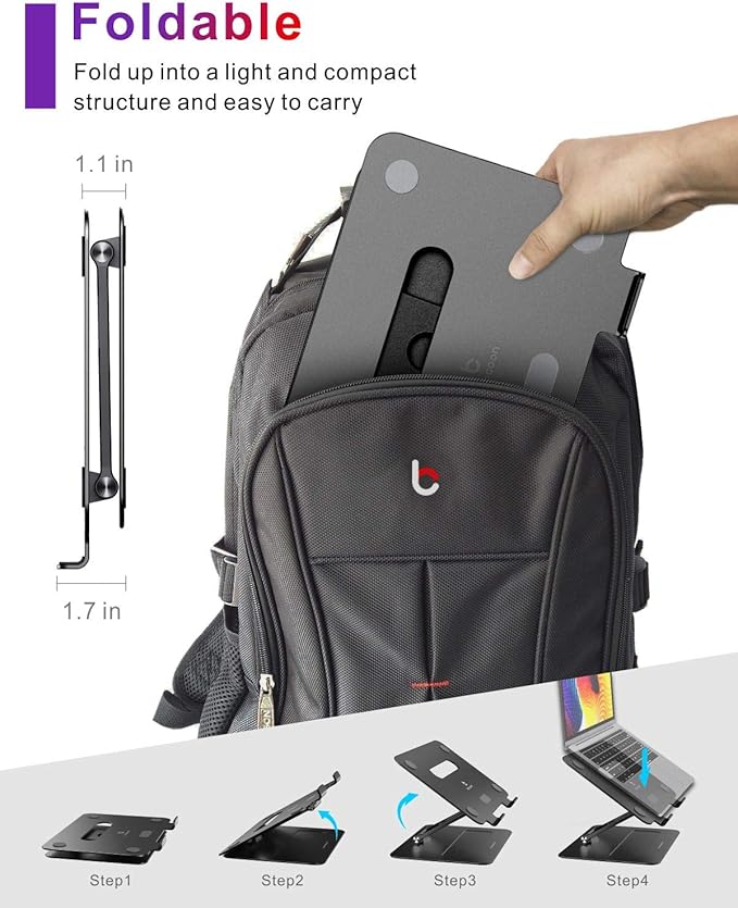 - 【Ventilated Cooling & Foldable】Laptop stand with aluminum alloy material on top can absorb and discharge heat at ease. What's more laptop riser has heat vent design increase natural airflow help you laptop cooldown, hence running at optimal performance longer, and even prolonging the life of your laptop. This computer stand can easily fold and fit into your bag and laptop case.